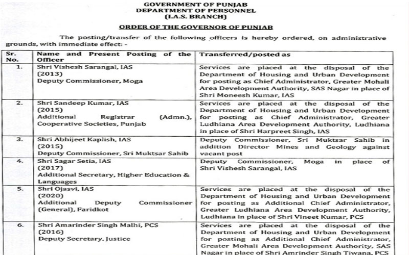 ਜਾਣਕਰੀ ਅਨੁਸਾਰ ਪੰਜਾਬ ਸਰਕਾਰ ਵੱਲੋਂ 5 ਆਈ.ਏ.ਐਸ. ਅਧਿਕਾਰੀ ਤੇ 1 ਪੀ.ਸੀ.ਐਸ. ਅਧਿਕਾਰੀ ਦਾ ਤਬਾਦਲਾ ਕੀਤਾ ਗਿਆ ਹੈ। ਜਿਸਦੀ ਸਰਕਾਰ ਵੱਲੋਂ ਇੱਕ ਕਾਪੀ ਵੀ ਜਾਰੀ ਕੀਤੀ ਗਈ ਹੈ। ਜਿਸ ਵਿੱਚ ਇਹਨਾਂ ਅਧਿਕਾਰੀਆਂ ਦਾ ਪੂਰਾ ਬਿਓਰਾ ਵੀ ਪ੍ਰਦਾਨ ਕੀਤਾ ਗਿਆ ਹੈ ਕਿ ਕਿਹੜੇ ਅਧਿਕਾਰੀ ਦਾ ਕਿੱਥੇ ਤਬਾਦਲਾ ਕੀਤਾ ਗਿਆ ਹੈ।