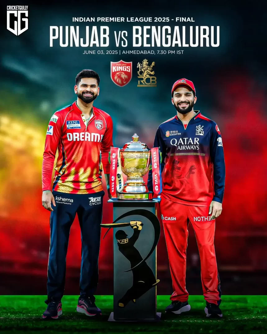ਅੱਜ IPL 2025 ਦਾ ਫਾਈਨਲ ਮੈਚ ਪੰਜਾਬ ਦੀ ਟੀਮ ਪੰਜਾਬ ਕਿੰਗਜ਼ ਅਤੇ ਬੰਗਲੌਰ ਦੀ ਟੀਮ ਰਾਇਲ ਚੈਲੇਂਜਰਜ਼ ਬੰਗਲੌਰ ਵਿਚਕਾਰ ਅਹਿਮਦਾਬਾਦ ਦੇ ਨਰਿੰਦਰ ਮੋਦੀ ਸਟੇਡੀਅਮ ਵਿਖੇ ਸ਼ਾਮ 7:30 ਵਜੇ ਖੇਡਿਆ ਜਾਵੇਗਾ।